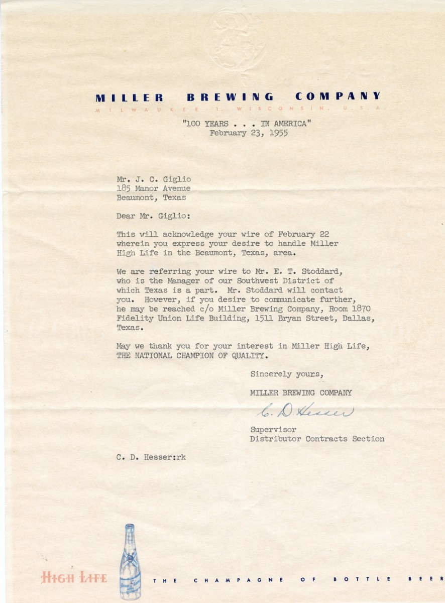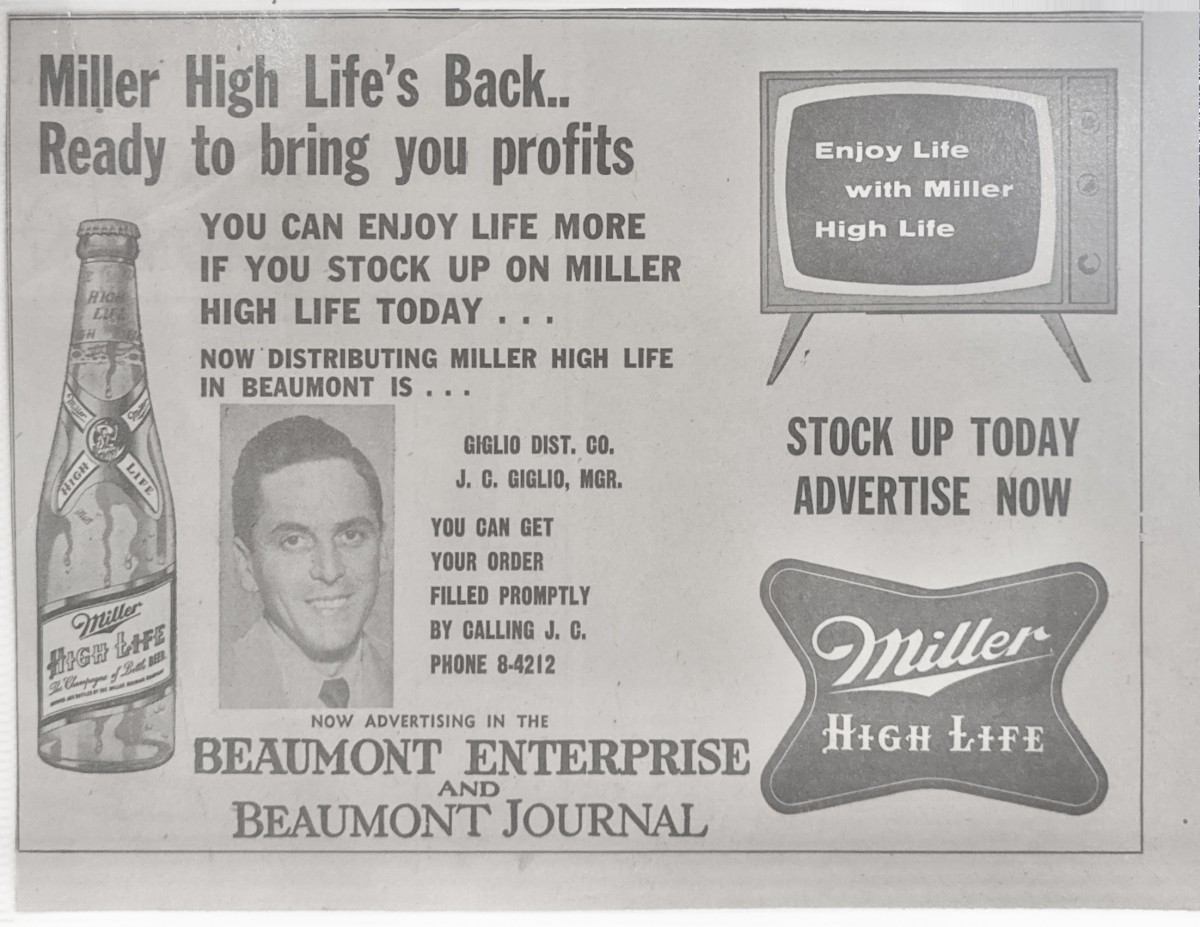April 15, 2025 marked 70 years of Giglio Distributing serving up good times and great taste in Southeast Texas, Northeast Texas, and Southwest Arkansas. J.C. Giglio began distributing Miller High Life with "one man, one truck, and a helper." The company has grown from annual sales of forty thousand cases in the first year to more than twelve million cases and the addition of thousands of products including beer, spirits, and non-alcoholic beverages.